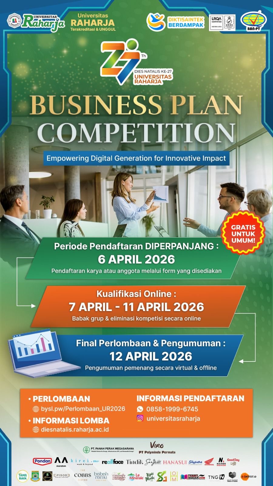 Kompetisi ini terselenggara berkat dukungan berbagai mitra strategis, mulai dari sektor korporasi hingga media partner, yang menunjukkan kolaborasi kuat dalam mendukung kemajuan pendidikan dan ekonomi kreatif di lingkungan Universitas Raharja.